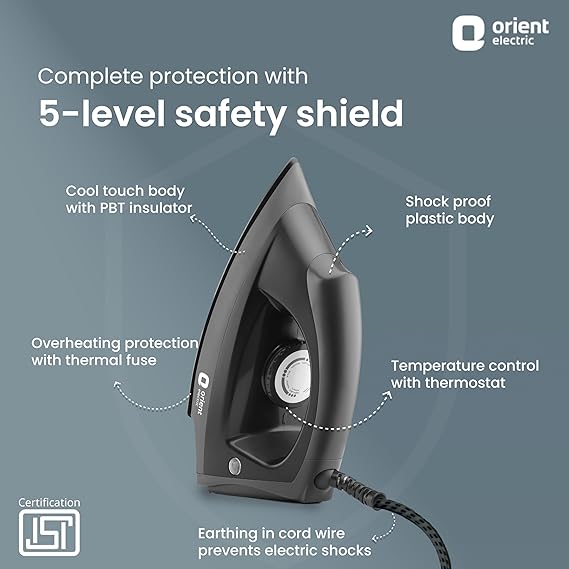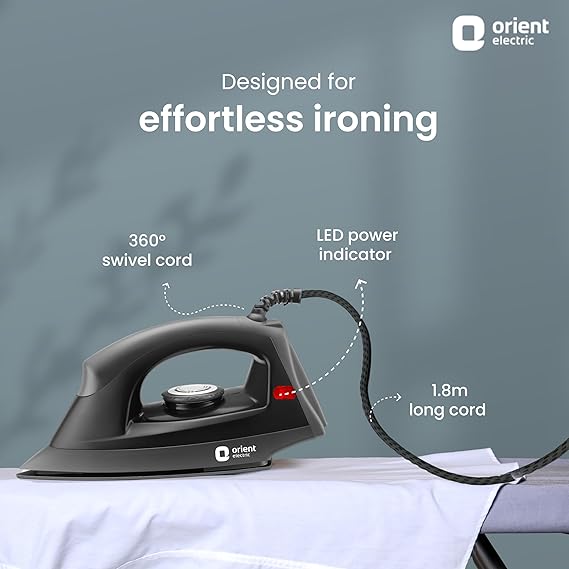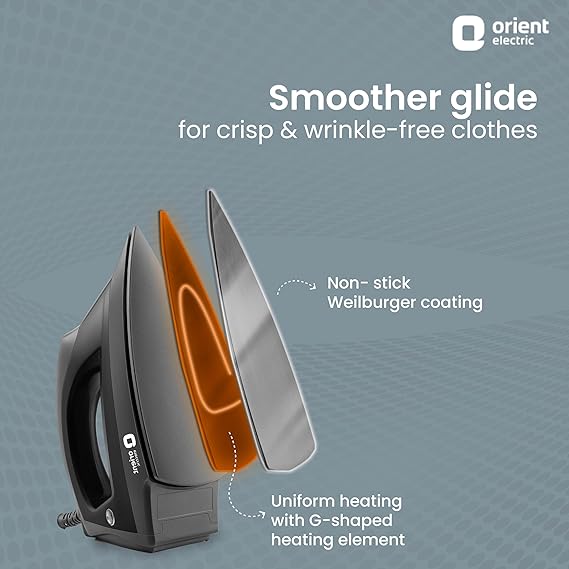 Orient Electric DIFG10GP Fabriglide 1000 W Dry Iron | German-made Weilburger coating on the soleplate| Silver Layered Thermostat for Better Heat Conductivity | 2 Years Warranty | Black and Grey