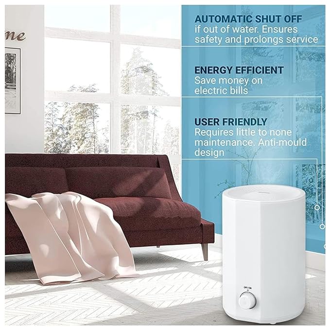 ALL NIGHT MIST & AUTOMATIC SHUT-OFF: Holding up to 3 liters of water, this cool mist humidifier allows up to 12+ hours of working time in high mist. It will automatically shut off when it will run out of water to prevent burning of the ultrasonic plate and keep your device safe.