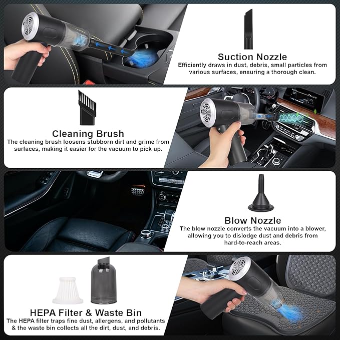 Pivalo 3-in-1 Vacuum Cleaner USB Rechargeable Wireless Handheld Mini Car Vaccum-Cleaners for Travelling Camping Reusable Portable with Charging Cable & 3 Attachments (Black, Pack of 1)