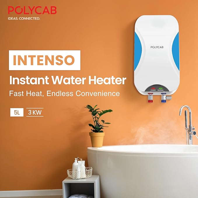 Polycab Intenso 5 litre, 3KW Electric Instant Geyser (Water Heater) For Home, Bathroom | Efficient Heating Element | Enhanced Safety Measures | 5 years tank & 2 years product warranty【White Blue】