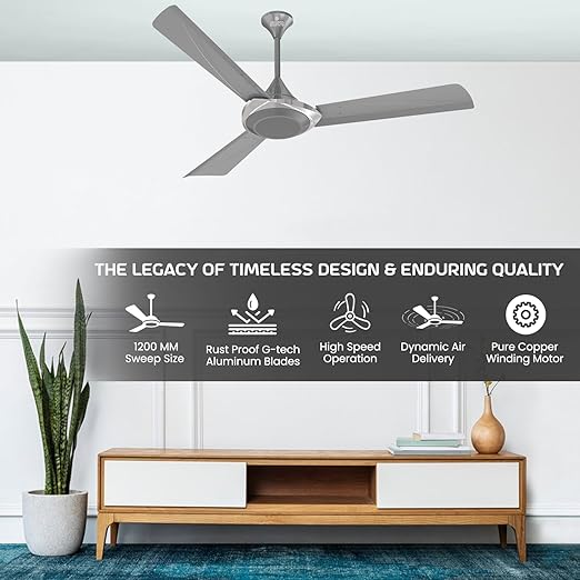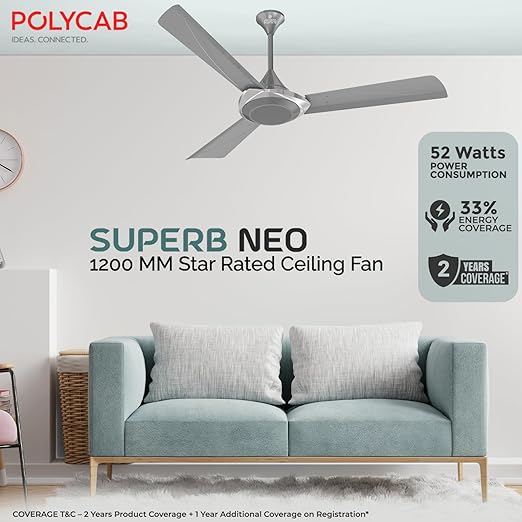 Polycab Superb Neo 1200mm Star Rated Ceiling Fan For Home | High Speed & Air Flow, 100% Copper | Rust Proof, Saves up to 33% Electricity | 2 years warrant【Cool Grey Silver】