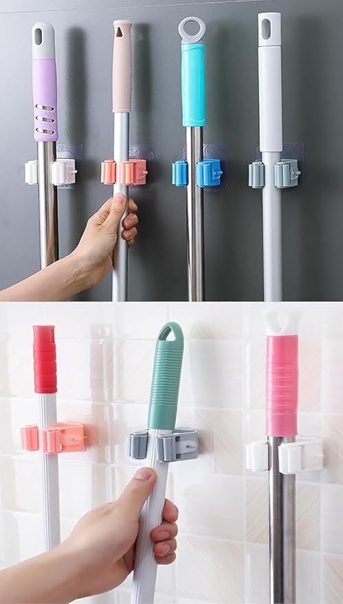 PRAJYA Mop Holder Self Adhesive Hooks, Broom Holder Wall Plastic Waterproof Multicolour for Bathroom & Kitchen, Multipurpose (Pack of 4)
