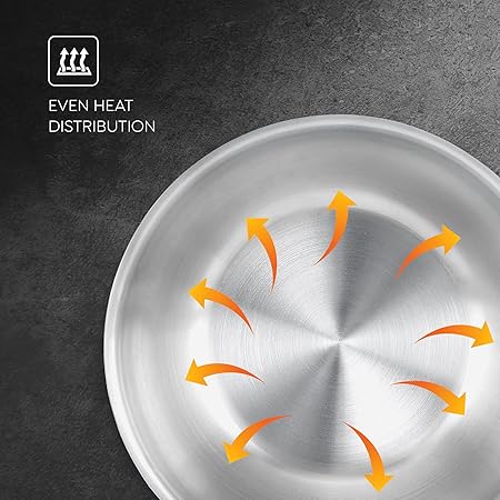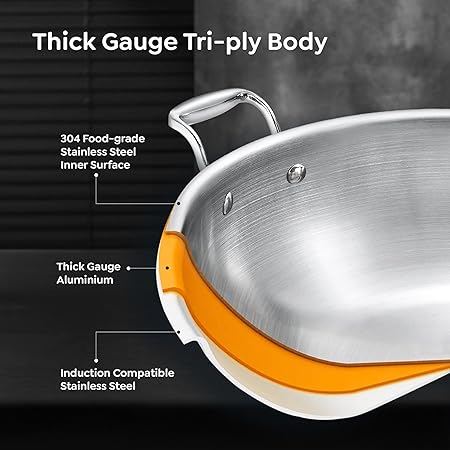 THICK GAUGE TRI-PLY BODY : 3 layers of metals from base to rim, inner layer is food grade stainless steel, an aluminium core ensures even heating and outer layer is stainless steel