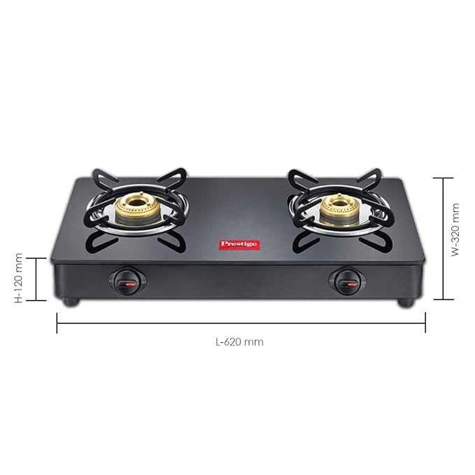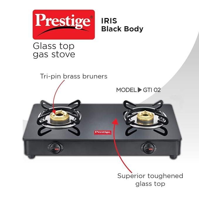 Prestige IRIS Toughened Glass-Top 2 Brass Burner LPG Gas Stove | Black | Spill Proof | Ergonomic Knobs | Tri-Pin Brass Burners |Open