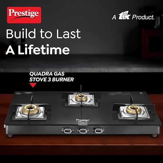 Prestige Royale Quadra 3 Burner Glasstop Glass Stove|Superior Toughened Glass with 5-Year Warranty| 3-Way Nozzle Design|Tri-Pin Jumbo Burner |Uniquely Designed Pan Support |Elegantly Designed Knobs