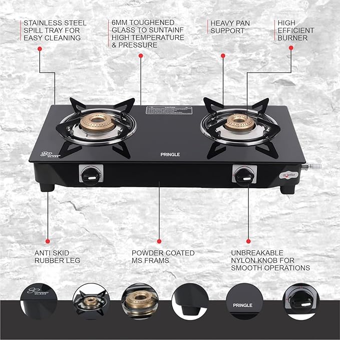 Glass Gas Stove Design: Pringle 2 Burners Gas Stove with a sleek glass surface is designed for home and kitchen use, offering a modern and efficient cooking solution.