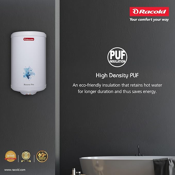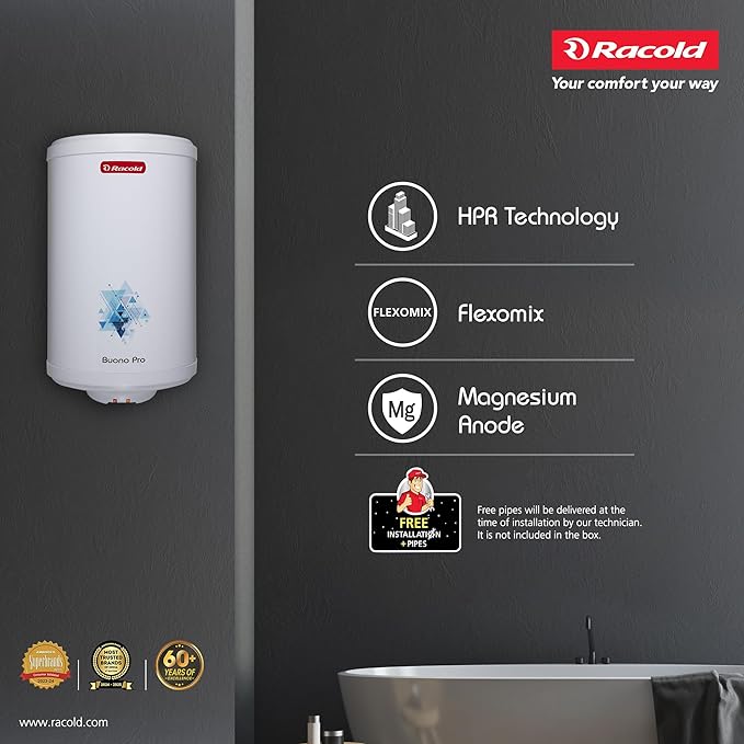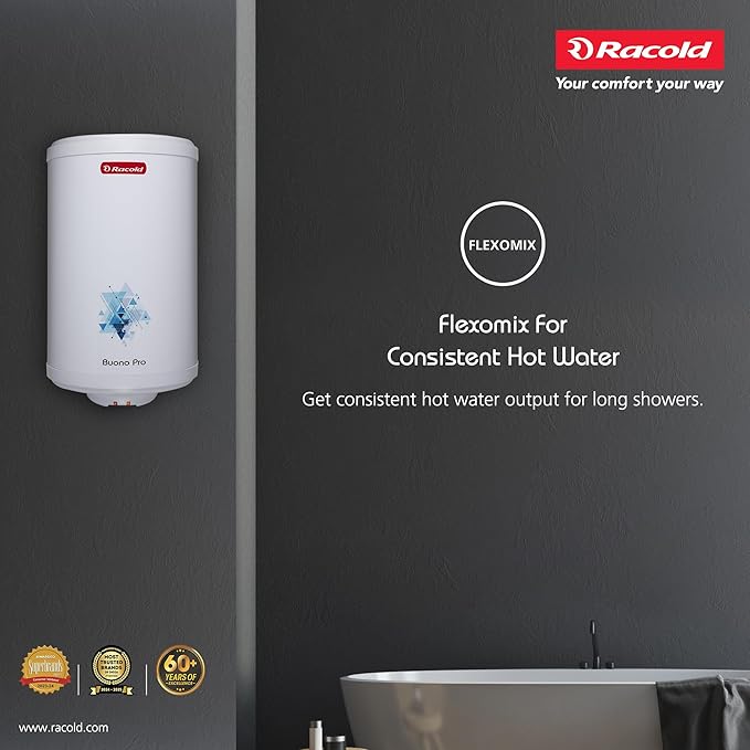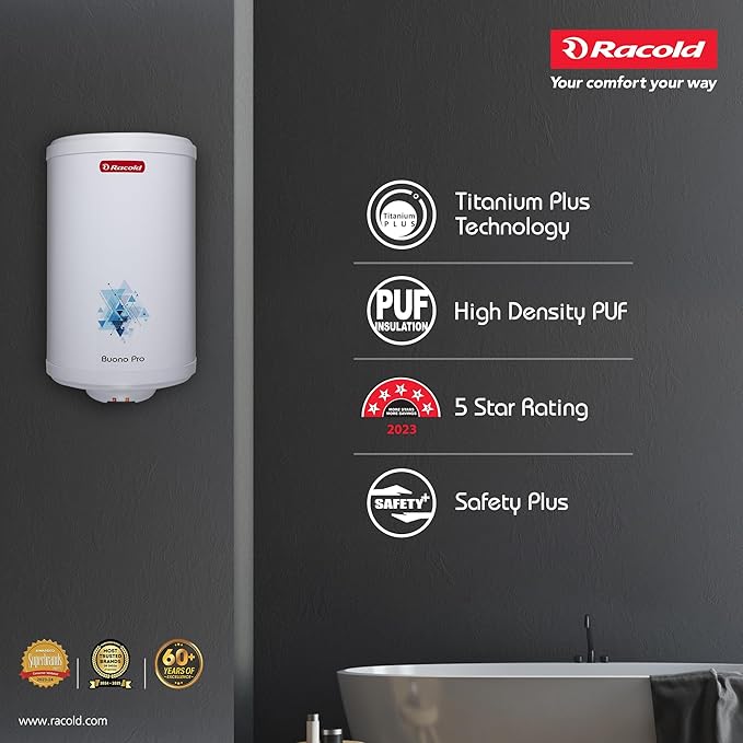 Racold BUONO PRO NXG Storage Water Heater 25L – Free Standard Installation & Pipes, 5 Star Rated, ABS Body Vertical Geyser for Bathroom,3 Safety Levels, Rust Proof Body with Titanium Coating, White