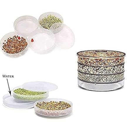 How to Use it : Basically each compartment has a hole covered by a knob through which water slowly seeps into the compartment below that. Put grains/pulses in the compartments, keep lowest compartment empty, make sure the knobs of adjacent compartments are positioned in diametrically opposite directions. Fill the compartments with water , not exceeding the level of the knobs. Wait for 12 to 24 hours.