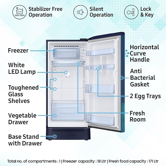 Interior Description : Fresh Food Capacity : 171 Ltr | Freezer Capacity : 18 Ltr | Total no. of compartments : 1 | Shelves : 2 | Vegetable Drawers : 1 | Shelf Type : Toughened Glass Shelves | Anti Bacterial Gasket | Base stand with Drawer for additional space for non-refrigerated food items