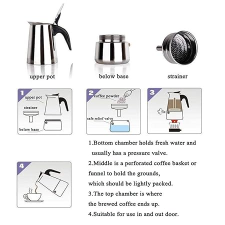 ✪Simple Steps – The Coffee Maker Espresso Machine, is easy to use: Fill the lower part of the three-part espresso maker with water, put the ground coffee into the basket, put the top on and place the stainless steel espresso pot on the cooker to boil.