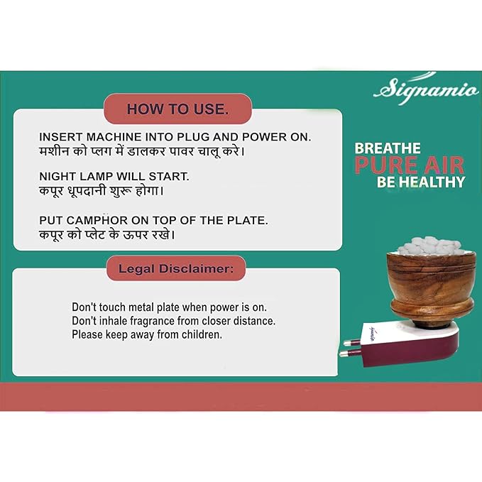 Experience the traditional fragrance of kapoor (camphor) (CAMPHOR TABLET NOT INCLUDED) with modern convenience. SIGNAMIO electric diffuser, kapoor dani, karpuram machine efficiently spreads the aroma throughout your space.