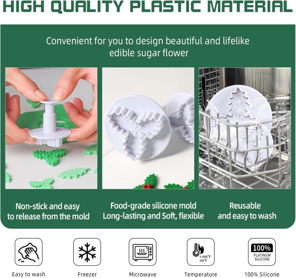 This set has 3 holly leaf molds, which is perfect for baking lovers. Durable, flexible, non-stick, and easy to remove pastry and clean. The product is eco-friendly and odorless, very safe for use.