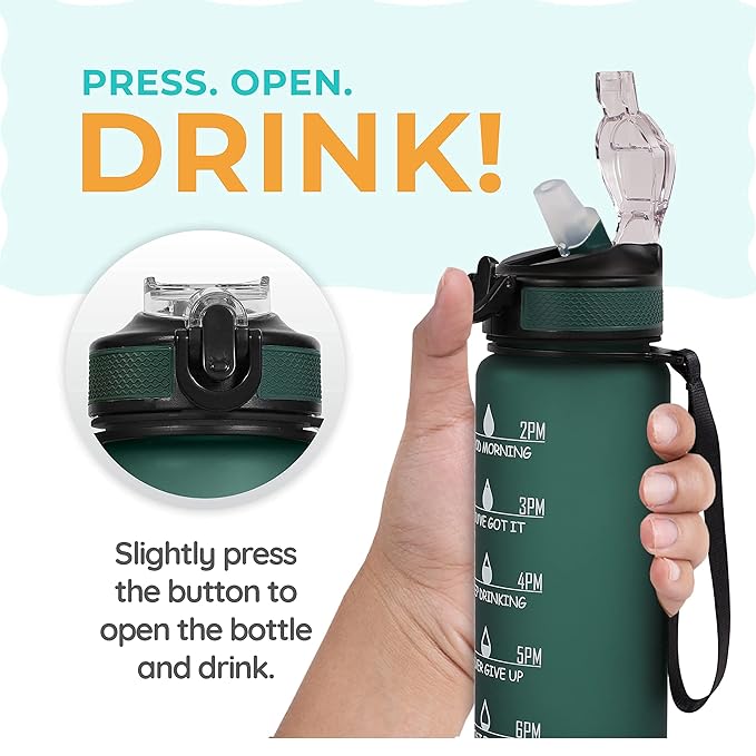 SOLARA Unbreakable Water Bottle 1 Litre with Motivational Time Marker, Leakproof Durable BPA-Free Non-Toxic Water bottle for office,Water bottle for gym | Detoxing eBook included | Hunter Green