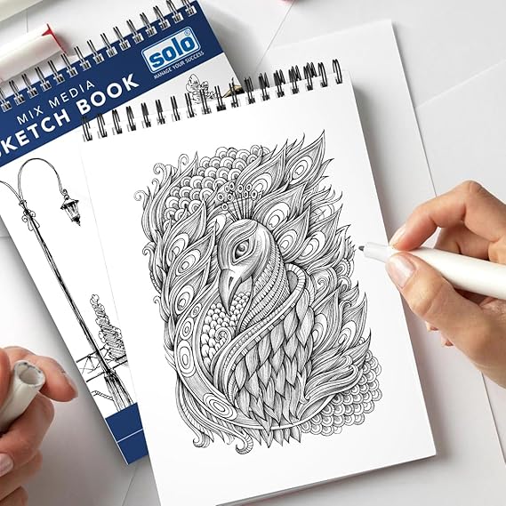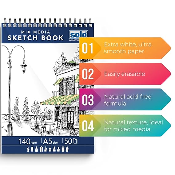 SOLO MIX MEDIA SKETCHBOOK SPECIFICATION: Your artistry with Solo mix media sketchbook or drawing/craft book set, featuring 50 sheets/pack catering to artists of all levels. Each spiral-bound artbook boasting 50 acid-free sheets of 140 GSM heavyweight paper. Sized at 14.8 x 21 inches (A5), it’s perfect art material for sketching, drawing, and painting with a variety of mediums such as pencils, markers, paints, watercolor and pens.