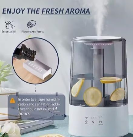 Aromatherapy function: It works as an essential aroma diffuser humidifer which adds essential oil in the aroma therapy box for a more relaxing experience. Do not add the essential oil in the water tank