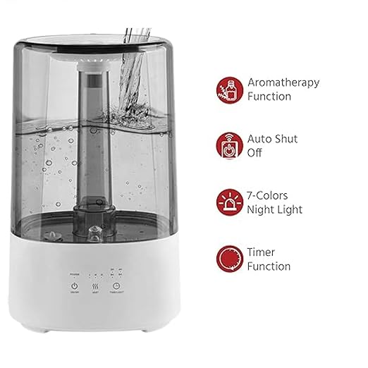 Timer and Light Mode: The air humidifier for room moisture has 4 time setting function (2/4/6/8 H) and 7-colors night lightSimple click “TIME/LIGHT” button to choose time setting and long press to choose lights