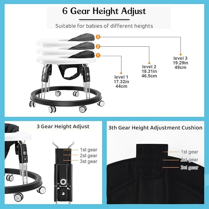 💺6 Levels of Height Adjustment: The starAndDaisy baby walker has a 6-speed adjustable height (3-speed frame + 3-speed seat adjustment), parents can adjust the height according to the baby’s growth and comfort.