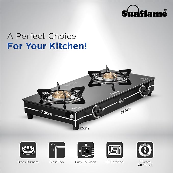 Sunflame Pride 2 Burner Gas Stove | 1 Medium and 1 Small Brass Burners | 2-Years Product Coverage by Sunflame | Ergonomic Knobs | Easy to Maintain l Toughened Glass Top | PAN India Presence