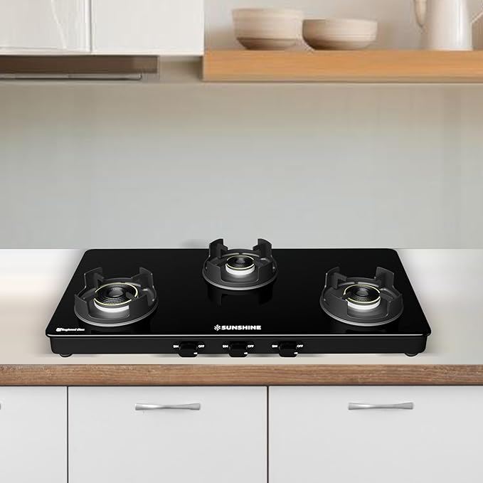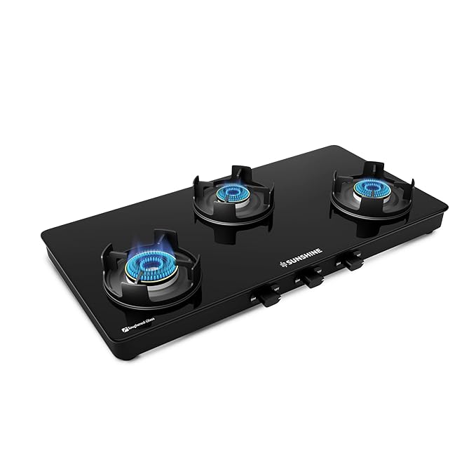 Sunshine Regal Pro 3 Burner Gas Stove Toughened Glass Cooktop Manual Ignition| Black Powder Coated Body | ISI Certified | 2 Years General Warranty (Burner, Gas Valve and Glass – 5 Years) (3 Burner)