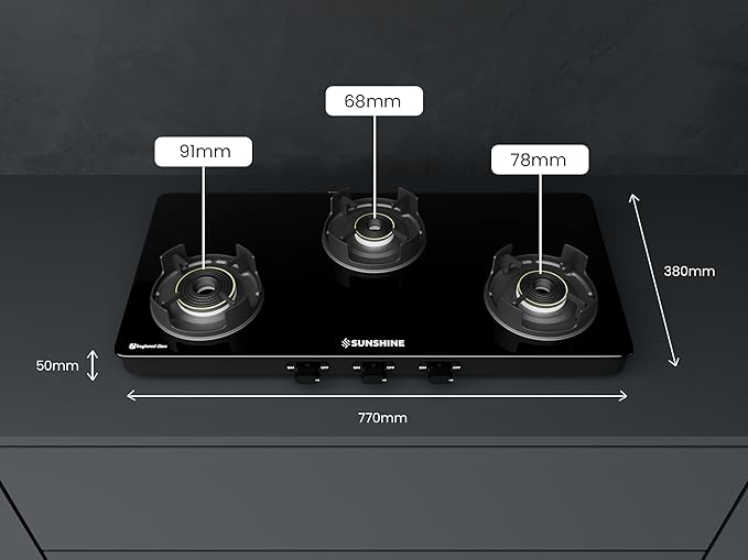Compact Dimensions: The gas stove is designed with dimensions (LxWxH) of 770x380x50 mm, providing a compact and space-efficient solution for your kitchen.