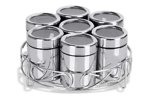ProKart Premium 7 in 1 Stainless Steel (SS) Masala Dabba Wire Stand Multipurpose Masala Box | Masala Dani For Kitchen Spice Containers 7 Jars 7 Spoons 200ml Each Steel (7 Jars + 7 Spoons + 1 Stand)