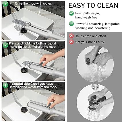 SELF-SQUEEZE TECHNOLOGY: The portable mini mop features self-squeeze technology, allowing you to effortlessly squeeze out excess water from the mop head without using your hands. This feature ensures that the sponge effectively absorbs dirt, dust, and spills, leaving your floors and surfaces clean and shiny. Portable mini mop home kitchen cleaning tools