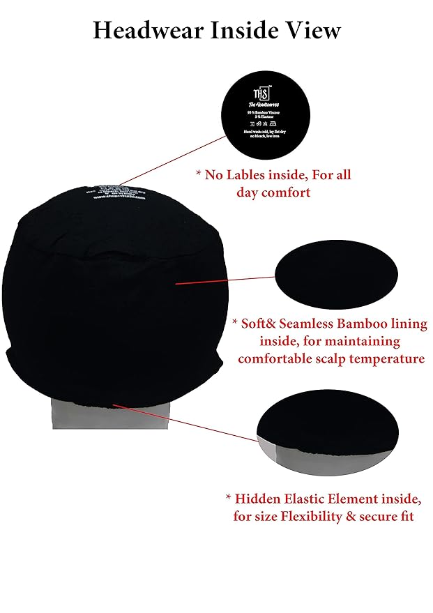 ⭐Size Options: Free size fits all. One size fits most with a double layer and minimal seam Head Circumference (“21-24”) Inches, Single jersey knit with stretch.