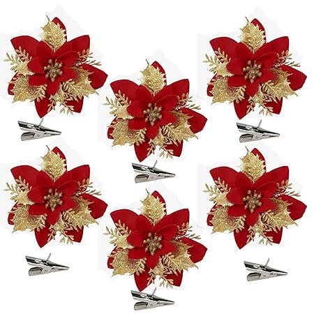 Package includes :- 6 Pcs Artificial Poinsettia Flowers Heads With Clip Stick, Size : 13.9 cm, Material : Velvet, Color : Red & Golden