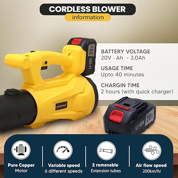 HIGH-PERFORMANCE AIR FLOW: Experience exceptional air flow speed of up to 200km/hr (110MPH) and a maximum air volume of 450 CFM. This powerful output makes the TOMAHAWK TLB040 perfect for efficiently clearing leaves, dust, and snow from large areas, ensuring your outdoor spaces are clean and well-maintained.