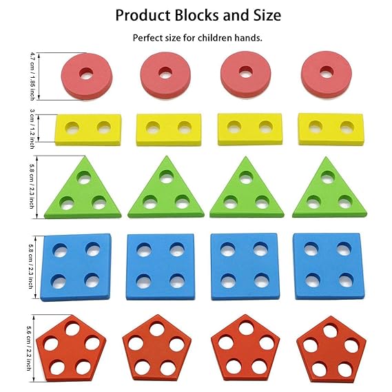 How to Play: Multiple paying way, select and name the geometric shape or color, stacking the block puzzle and march it in right place (posts that fits the hole of the blocks) etc.; Great Toys: Great brain stimulating toys, teaches about colors, shapes, matching, logic, fine motor skills , inspire toddler’s imagination, hand-eye coordination and promote their physical and intellectual development.