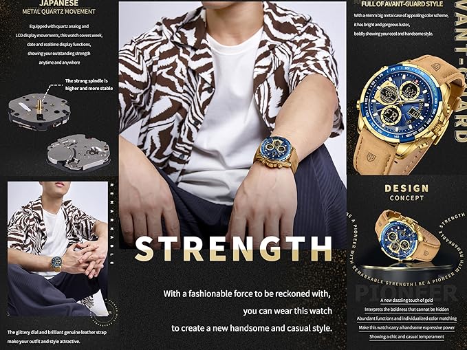 Material: Anti-scratch mineral glass and environmental protection vacuum plating case never fade. Genuine leather strap, delicate and soft.