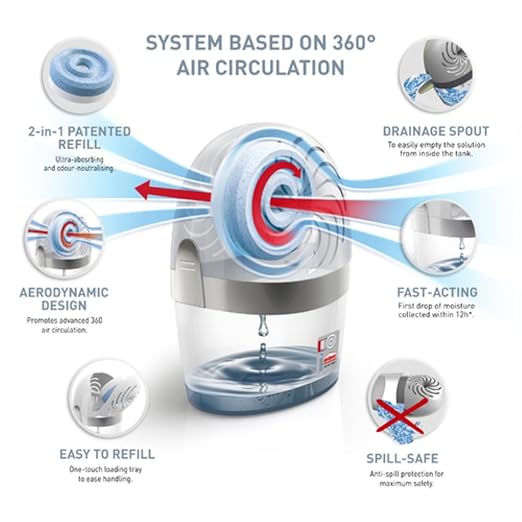 Safe and silent – The AERO 360° humidity absorber device functions without electricity and provides maximum safety thanks to its spill-prevention system.