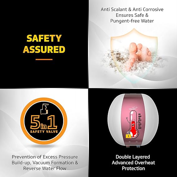 SAFETY ASSURED: IPX4 Rating for safeguarding from spills & splashes; Advanced Thermostat & Thermal Cut-out Mechanism for Dual Overheat Protection; 5-in-1 Multi-function Safety Valve prevents excessive Pressure Build-up, Vacuum Formation & Reverse Water Flow