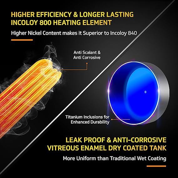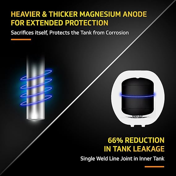 BUILT TO LAST: Anti-corrosive Titanium enriched Vitreous Enamel Tank Coating; Superior 2kW Incoloy 800 Heating Element; High-quality Steel Inner Tank, Single Weld Line Design for tank leakage protection; Magnesium Sacrificial Anode for hard water usage and scaling protection; Outer-body made of rust-proof ABS which lends significant strength to the body