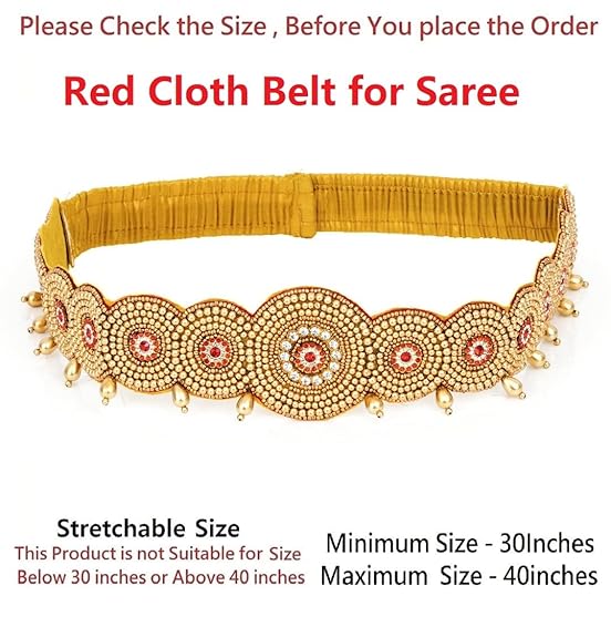 This Traditional embroidery Red cloth waist belt for women saree Is stretchable and is Studded with Green Crystal Stones & Cream colour Beads
