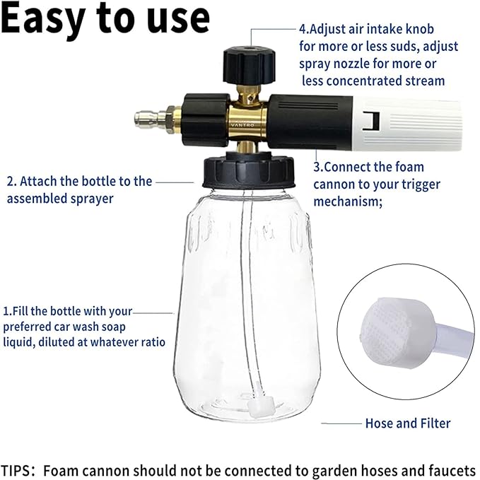 Vantro Adjustable Transparent Foam Cannon 1 Liter Bottle Transparent Foam Lance with 1/4″ Quick Connector Thick Foam Blaster for Pressure Washer