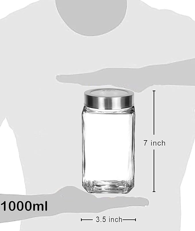 Vency Glass Square Shape Transparent Glass Jars & Containers For Kitchen Pantry,Snacks,Masala,Pickles,Dry Fruits,Coffee Beans Storage With Steel See Through Lid(Set Of 6)(1000Ml Steel Cap),Blue