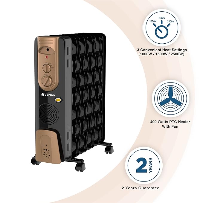 About this item Curved fins for faster and Efficient heat transfer Safe and Comfortable Heating 400 Watts PTC Heater with Fan 3 Convenient Heat Settings(1000W/1500W/2500W) Tip Over Safety Switch ISI mark for Quality & safety Guarantee -2 Years on Product