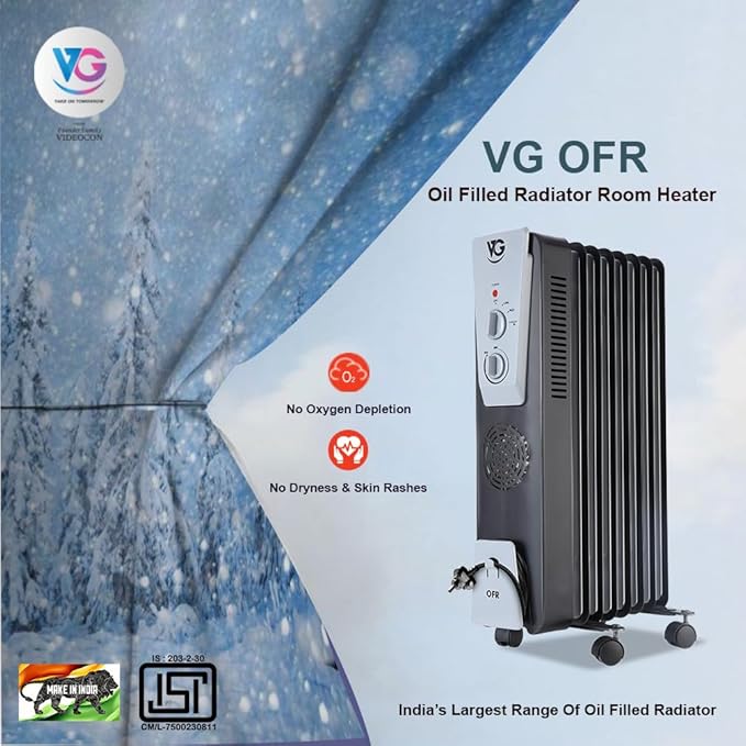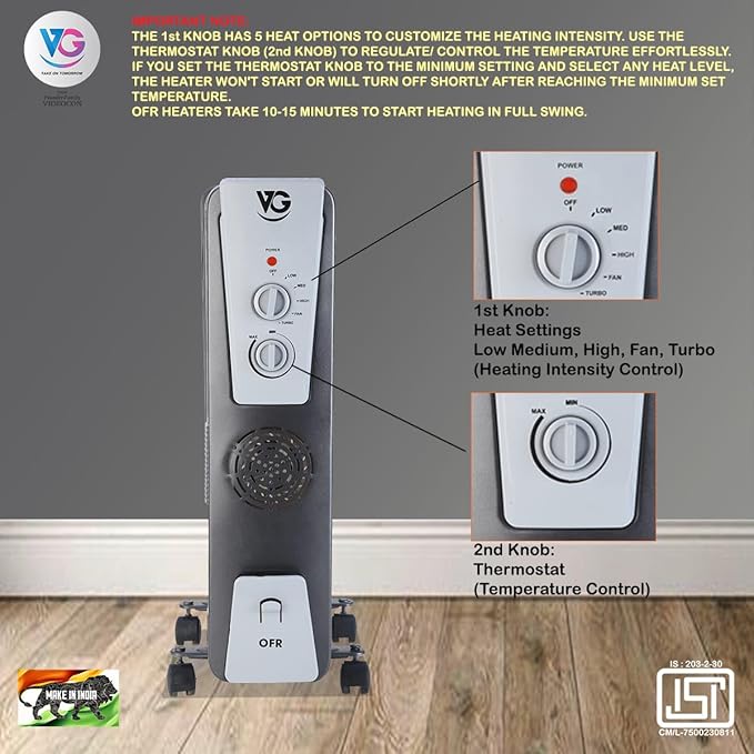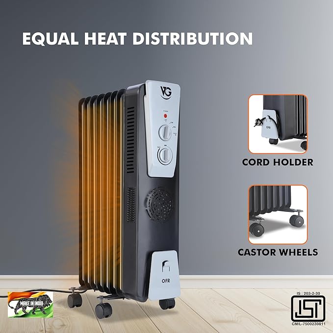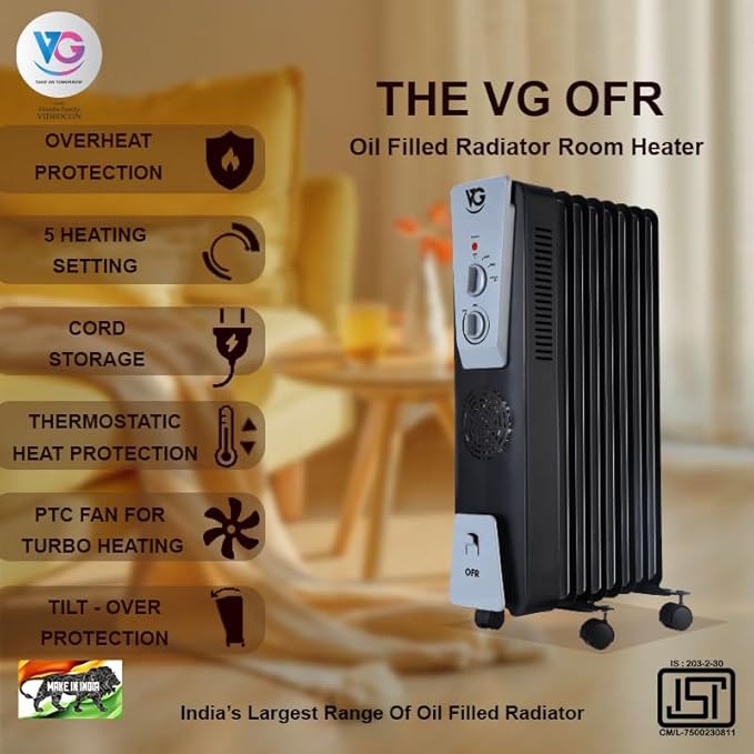 VG OFR Room Heater, 8 Fin 1900 Watts Oil Filled Room Heater with PTC Ceramic Fan Heater, ISI Approved | 3 Years Warranty | Customer Care: +91 9619 955 955, service@vgdigi.com (OFR 8F, Black)