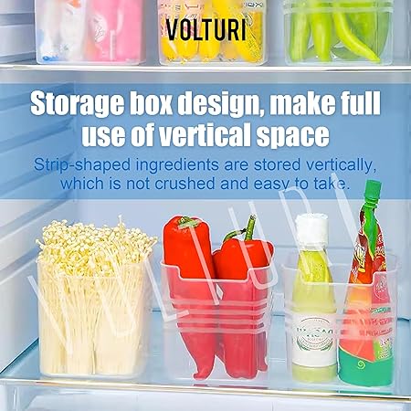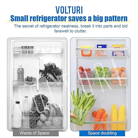 Perfect Size: The VOLTURI kitchen organizer container box bins are meticulously designed to fit seamlessly into the refrigerator side door, maximizing space utilization and saving valuable fridge space. By storing vegetables separately in these containers, freshness is preserved, spoilage is minimized, and healthier storage habits are encouraged. Plus, their convenient design ensures easy access with just a simple open of the fridge door.