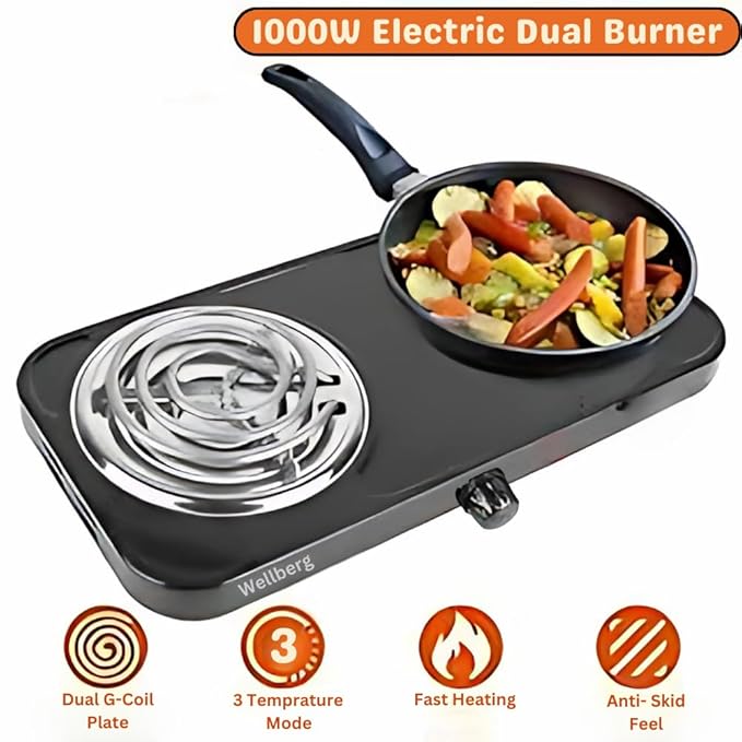 Wellberg Electric Double Hot Plate, 2 Type Single/Double Coils, Black
