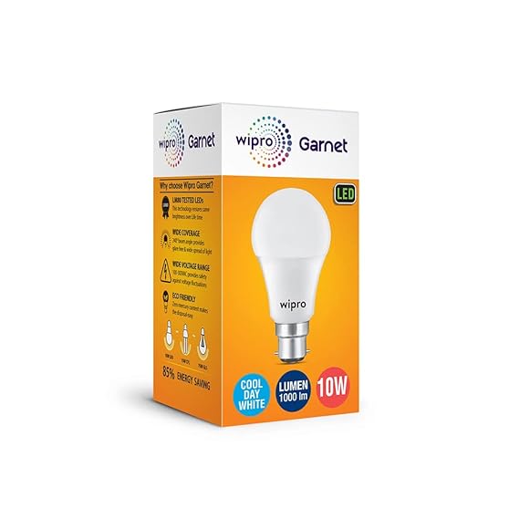 Wipro Garnet 10W LED Bulb for Home & Office |Cool Day White (6500K) | B22 Base|220 Degree Light Coverage |4Kv Surge Protection |400V High Voltage Protection |Energy Efficient | Pack of 1
