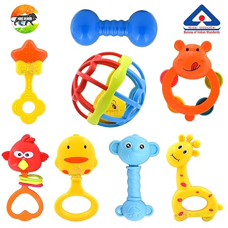 WISHKEY Colorful Attractive Plastic Non Toxic Set of 8 Shake & Grab Rattle BPA Free for New Born and Infants (Pack of 8, Multicolor)