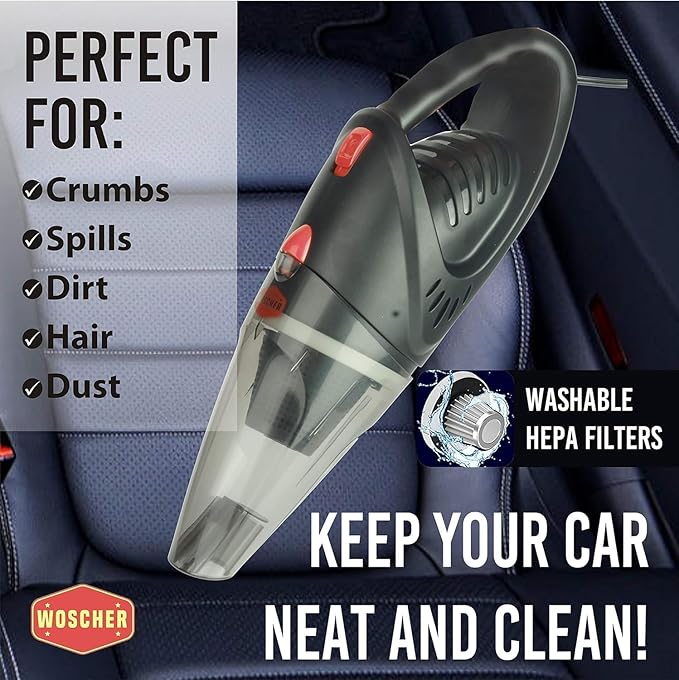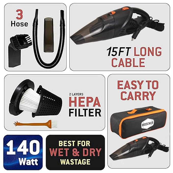 WOSCHER 2003 High Power Auto Car Vacuum Cleaner for Deep Cleaning, Hand Held Portable Cars Vacuum for car Cleaning with DC 12V, 140W Vacuum Motor & 5000 PA Powerful Suction, Black