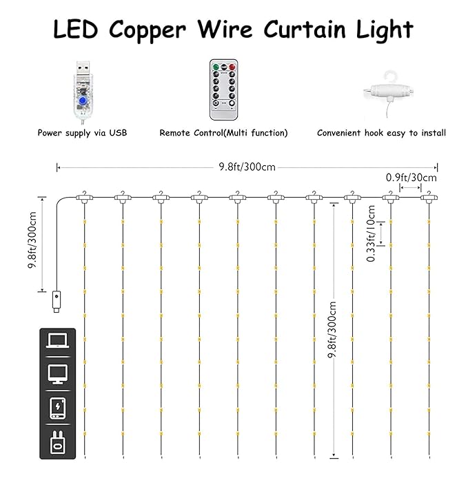 XERGY Window Curtain String Light Resin 300 LED 8 Lighting Modes Dimmable Fairy Lights Remote Control USB Powered for Home Decoration Light Diwali House Party Wedding Decor (Warm White)