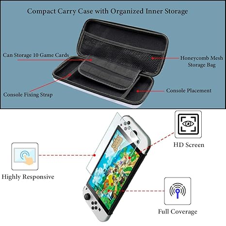 4 in 1 Accessories Bundle: Designed for Nintendo Switch OLED, the package includes a 1 x carrying bag, 1 x Screen Guard, 4 x Thumb Grips & 1 x Protective Cover. Offering upgraded protection, multi-place storage and thoughtful design, the portal accessories set is at a competitive value.